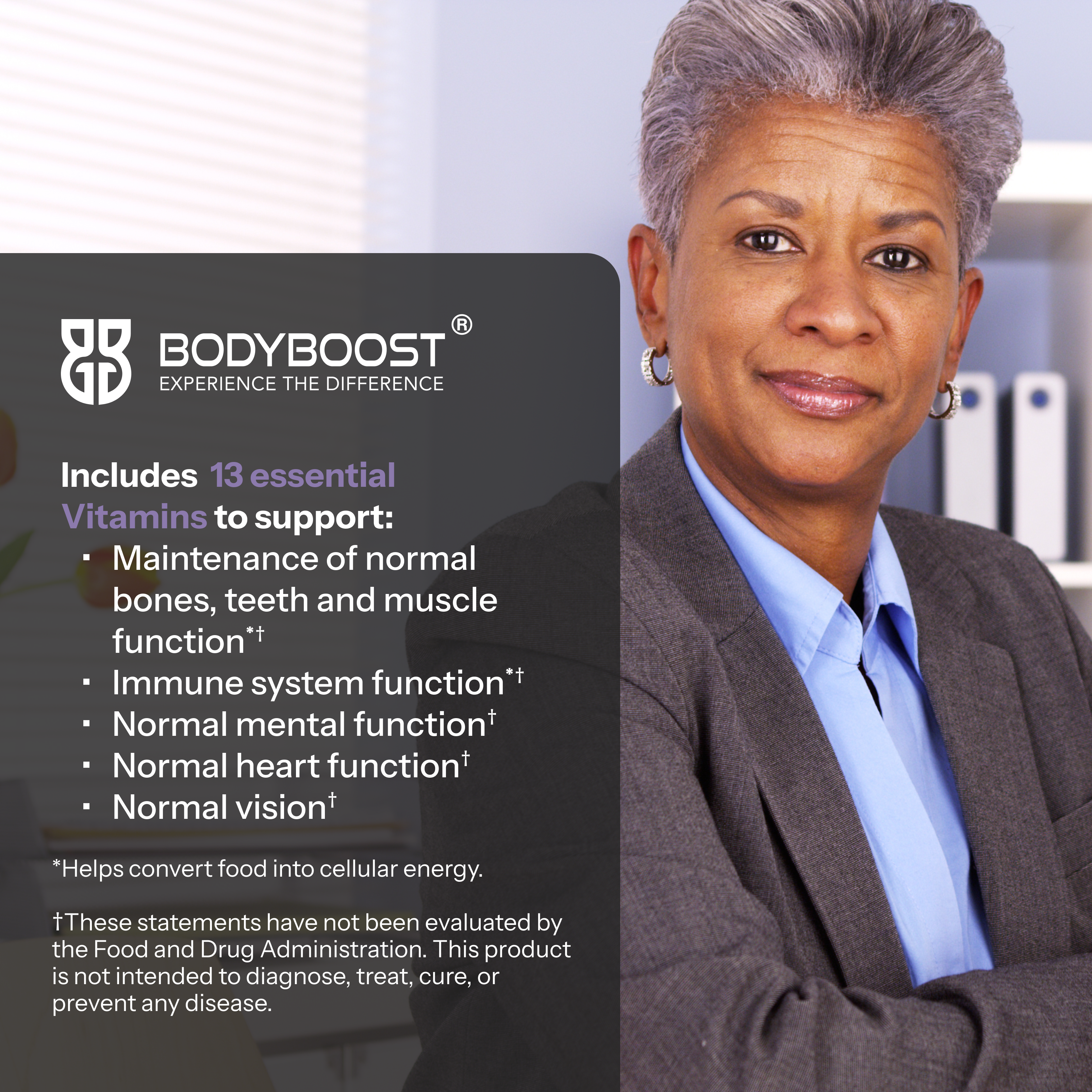 Take charge of your health with confidence using BodyBoost 50+ Women Multivitamin. Formulated with care and backed by scientific research, this multivitamin helps you feel and live your best. You deserve high-quality nutrition that empowers you to thrive every day.