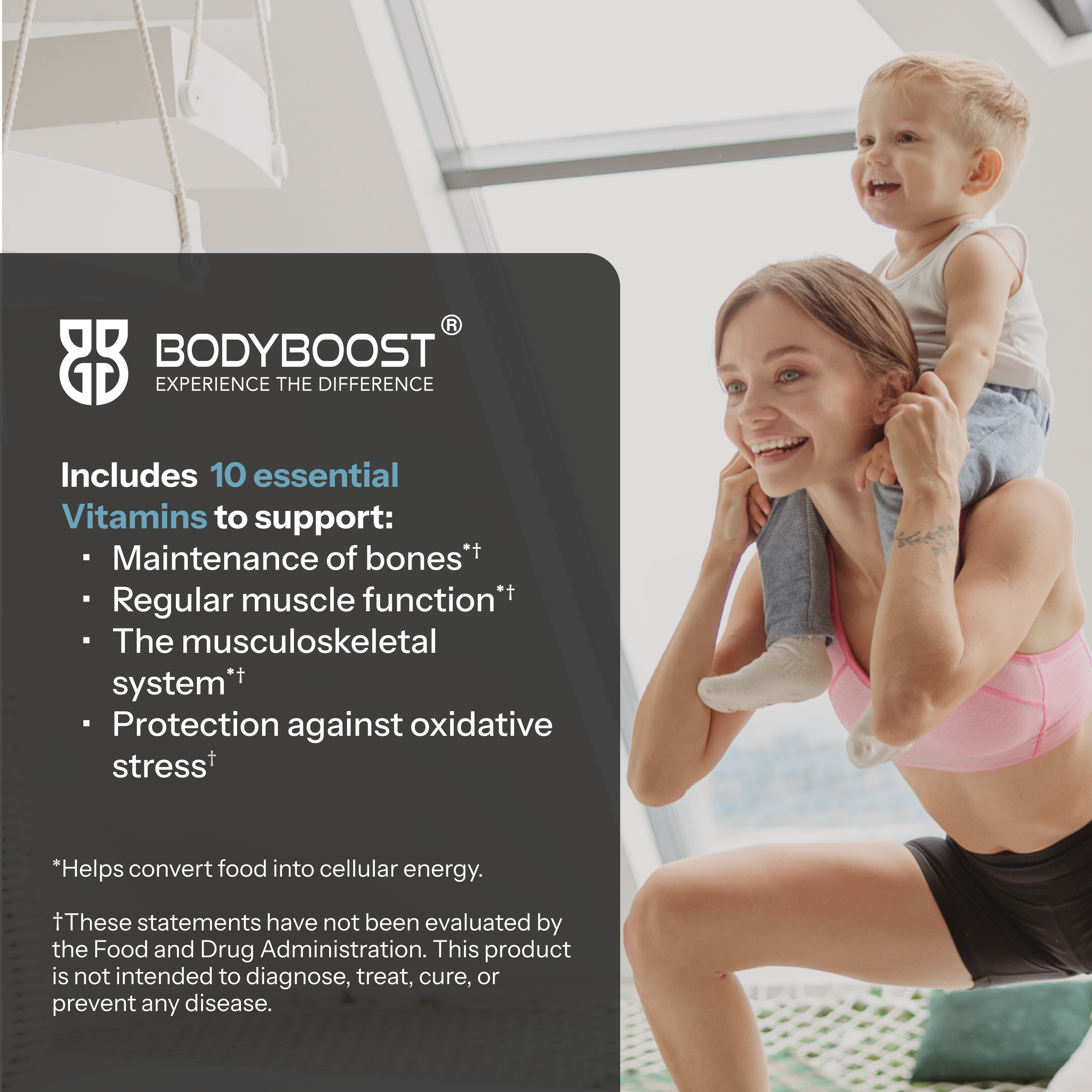 Cartilage and bone health are important for long term well-being, and mobility. bodyboost Joint & Bones Support is a next generation supplement developed by nutritional experts to provide a unique, effective combination of bio-available (easily absorbed) vitamins, minerals, and nutrients ideal for people of all ages seeking relief from discomfort, greater mobility, and an active lifestyle.*
