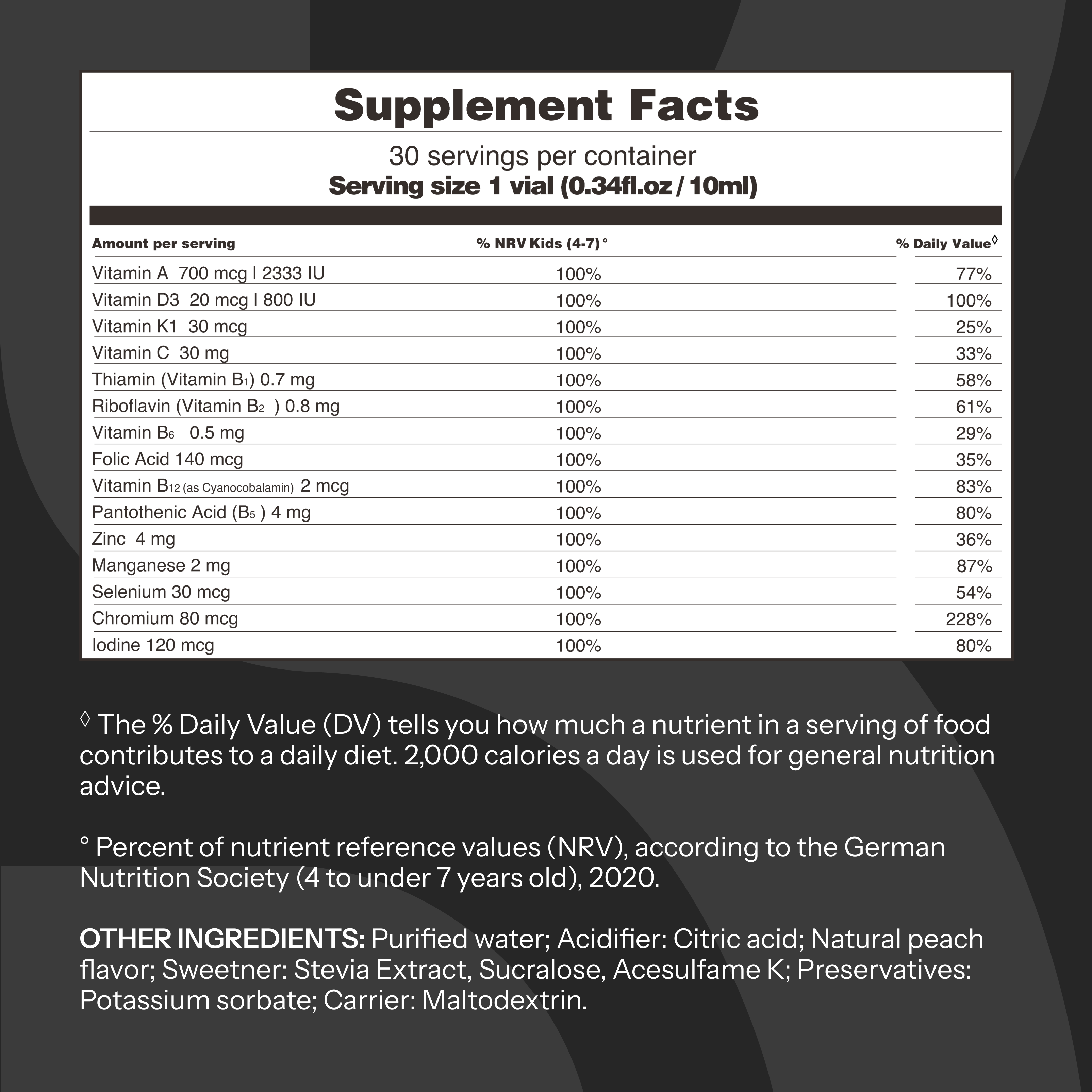 Other ingredients: Purified water; Acidifier: Citric acid; Natural peach flavor; Sweetener: Stevia Extract, Sucralose, Acesulfame K; Preservatives: Potassium sorbate; Carrier: Maltodextrin.