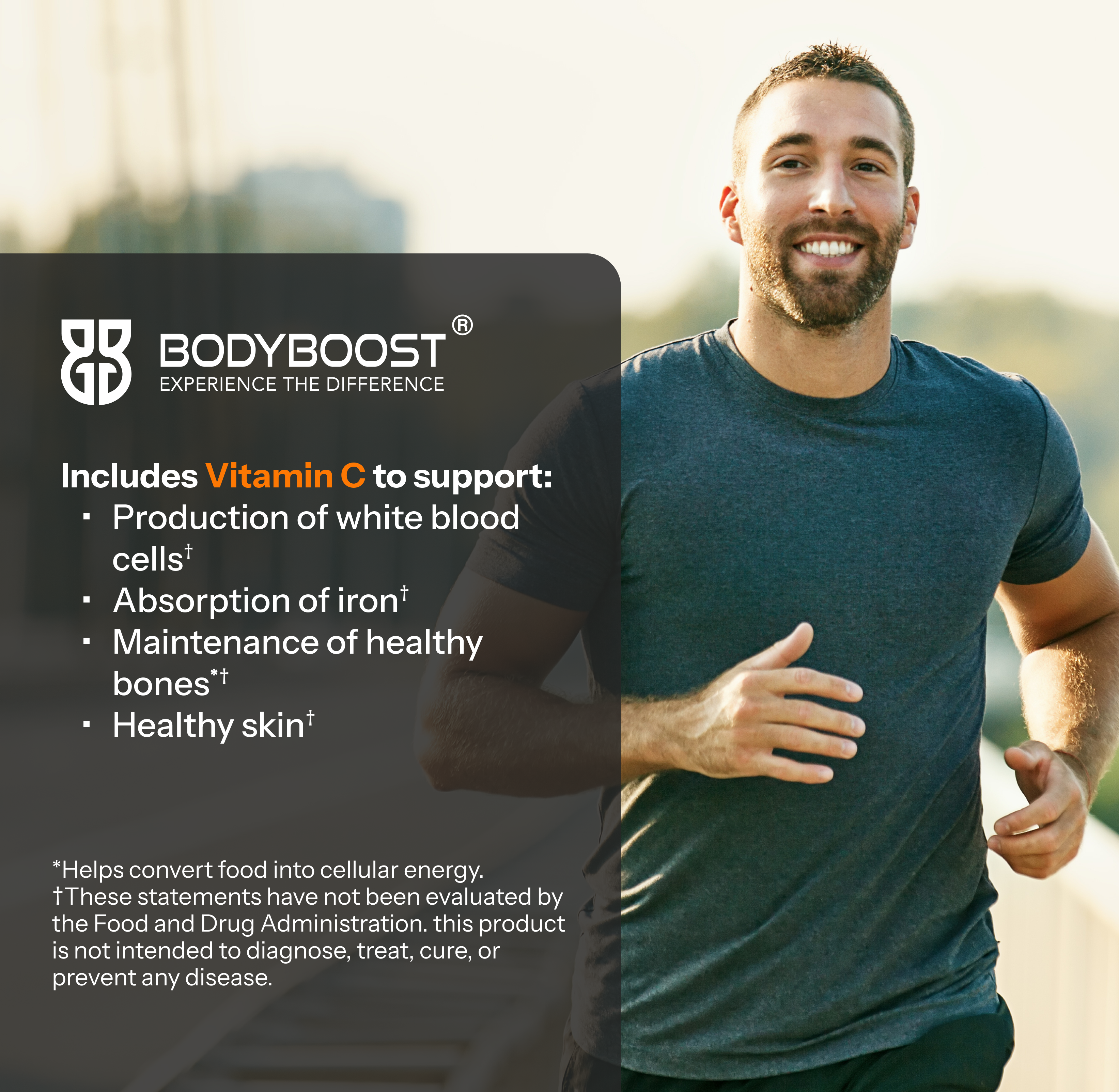 bodyboost Vitamin C 500 utilizes our unique Twist and Mix System™ to deliver fast, maximum benefits from this highly effective formulation.* Vitamin C is a powerful antioxidant that strengthens your body’s natural defenses. bodyboost Vitamin C 500 is a next-generation supplement providing advanced, bio-available (easily absorbed) nutritional support for overall health and vitality, as well as key nutrients that aid the efficient functioning of the immune system.*